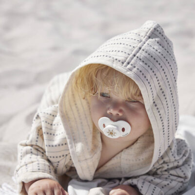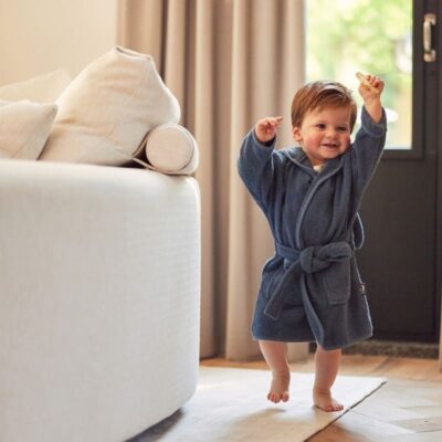 LEANDER – szlafrok z kapturem. Wykonany z miękkiej, organicznej bawełny frotte kaptur zapewnia dziecku ciepło i wygodę. Sprawdzi się w domu, na basenie i plaży.