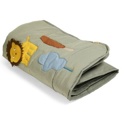 Przepięknie ilustrowana naszywanymi aplikacjami mata aktywności sensorycznej wykonana z organicznej bawełny.