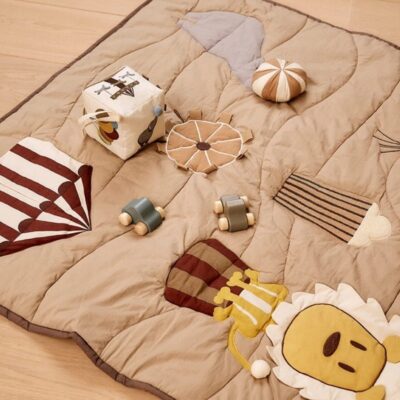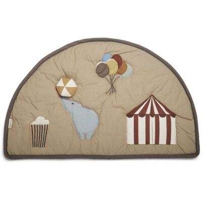 Kolorowa, dwustronna mata do zabawy inspirowana cyrkiem. Miękka bawełna i pikowane wypełnienie tworzą przytulną przestrzeń do zabawy i relaksu.