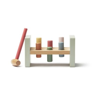Umieść drewnianą kulkę w otworze w pudełku i uderz młotkiem, aby wpadła do środka. Bam, bam, bam, uważaj! Nigdy nie wiadomo, z której strony wypadnie kulka. Zestaw zawiera trzy bejcowane drewniane kulki w różnych kolorach i młotek.
