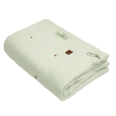 Przepiękna oddychająca kołderka muślinowa z podusią, którą dzięki specjalnie wszytym troczkom możesz łatwo związać i otrzymujesz rożek niemowlęcy. Dzięki rozmiarowi 70 x 90 cm kołderka może być używana od urodzenia do 3 roku. W zestawie podusia chmurka 20 x 40 cm. Idealna do łóżeczka, wózka, kołyski lub jako rożek.