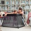 Łóżeczko podróżne BABYBJÖRN, które można rozstawić jednym prostym ruchem. Nogi rozkładają się automatycznie, a po umieszczeniu materaca powstaje stabilne łóżeczko do korzystania w domu lub w podróży. Nieużywane, można równie szybko i łatwo złożyć.