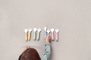 Sztućce dostosowane są do małych dłoni dziecka (odpowiednie zarówno dla lewo- jak i praworęcznych), posiadają wygodny uchwyt. Trzonki łyżeczki i widelczyka dla dzieci są krótkie i grube – dzięki temu maluchom wygodnie się je trzyma. Pierścień na trzonku zapobiega przesuwaniu się dłoni w kierunku jedzenia.