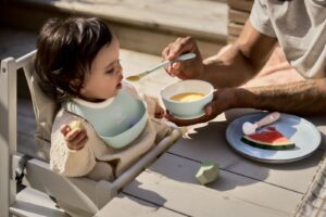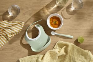 Miseczka oraz łyżeczka do karmienia mogą być używane od około szóstego miesiąca życia. Śliniaczek dla niemowląt jest już od około czwartego miesiąca życia.
