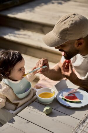 Niezbędny zestaw przy rozszerzaniu diety malucha oraz starszaków uczyć się jedzenia pokarmów stałych: mały śliniaczek z miękkim dekoltem i pojemną kieszonką, łyżeczka do karmienia z długą rączką i praktyczna miseczka dla dziecka.