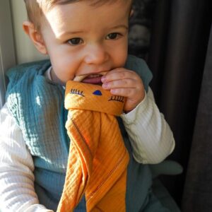 Gryzak wykonany został z 100% organicznego drewna bukowego, natomiast muślinowa przytulanka pieluszkowa ze 100 % wysokojakościowej BIO bawełny muślinowej z certyfikatem materiałowym.