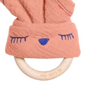 Mięciutka muślinowa przytulanka pieluszkowa dou dou z drewnianym gryzaczkiem z organicznego drewna bukowego.