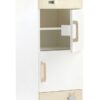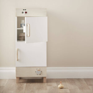 Dzieci będą się dobrze bawić, układając i przechowując żywność na półkach i w przegródkach, jakie można znaleźć w domowej lodówce z zamrażarką. W lodówce znajdziesz 2 wewnętrzne półki na drzwiach, jedną z 2 pojemnikami na jajka i dodatkową szufladę na dole, na warzywa i owoce. Suwak do regulacji temperatury. Klikający przycisk włączania/wyłączania. Zabawka wymaga złożenia przez osobę dorosłą.