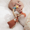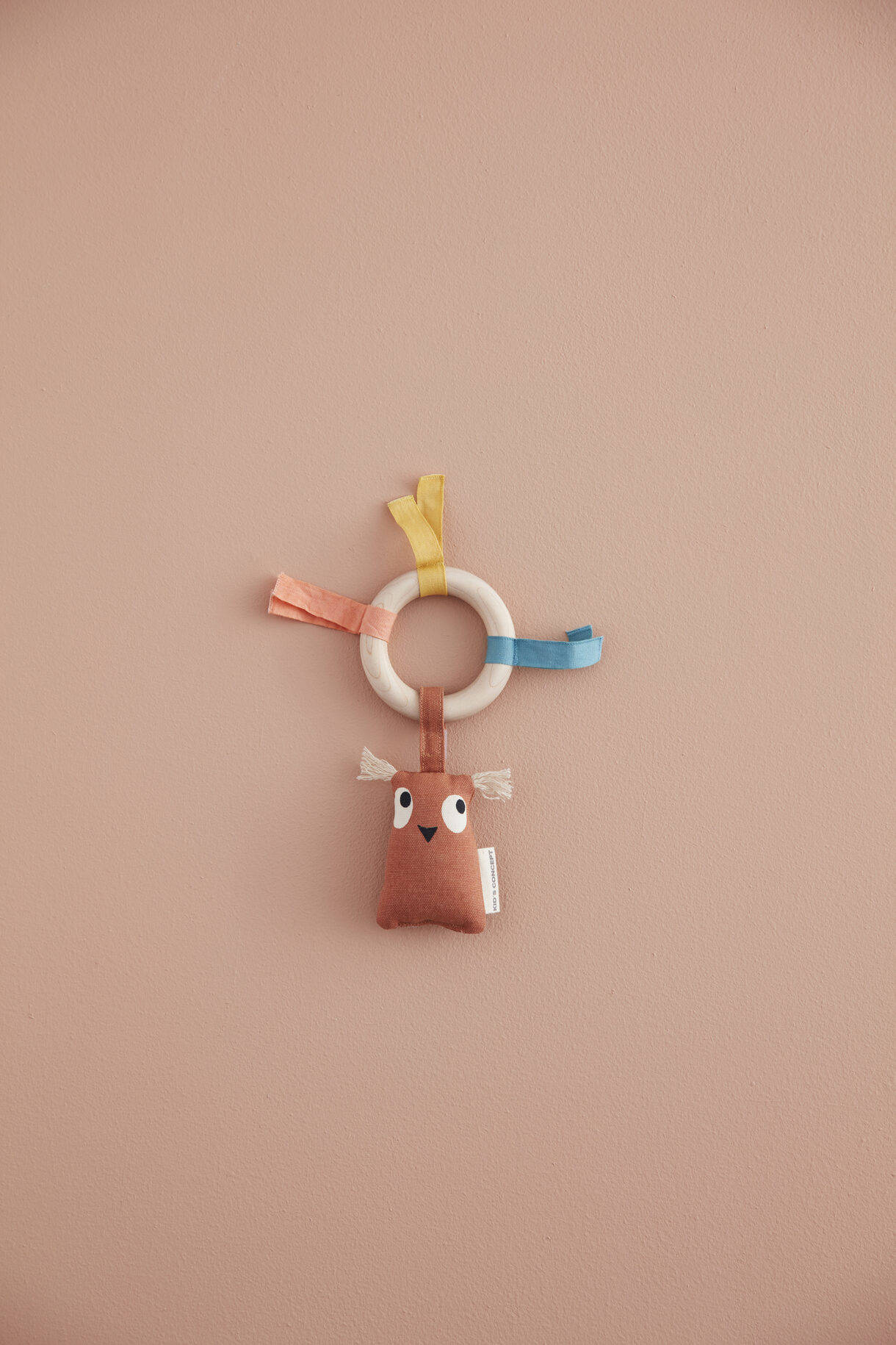 Elementy o różnej fakturze: drewniane kółko z drewna bukowego z certyfikatem FSC – do gryzienia, chwytania i zabawy, kolorowe wstążeczki i mięciutka sowa stymulują zmysły i pozytywnie wpłyną na rozwój sensoryczny Twojego dziecka.