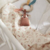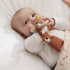 - Tkanina: 100% bawełna z certyfikatem GOTS. Wypełnienie: 100% poliester. Grzechotka wewnętrzna: HDPE.
