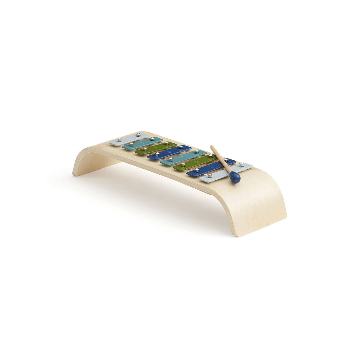 Zabawkowy ksylofon ze sklejki bejcowanej naturalnie z białymi płytkami.