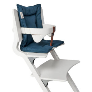 LEANDER – krzesełko do karmienia CLASSIC™, białe + barierka, tacka, poduszka Dark Blue – ZESTAW