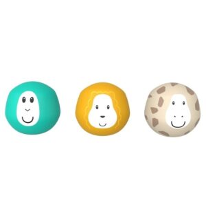 Każda piłeczka jest jak małe zwierzątko: lew, małpka i żyrafa.