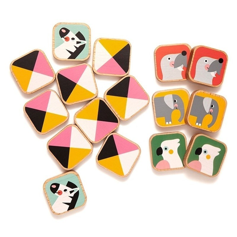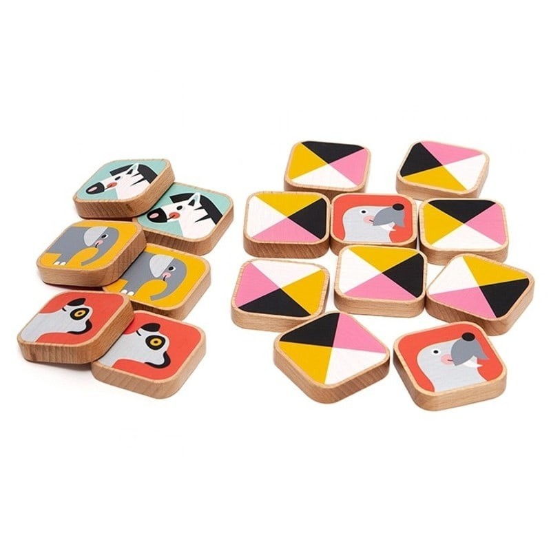 Gra memo wykonana z drewna bukowego ze wspaniałymi malowanymi ilustrowanymi zwierzętami.