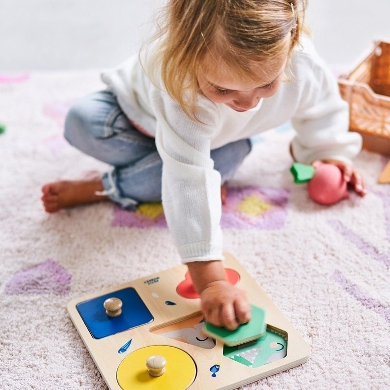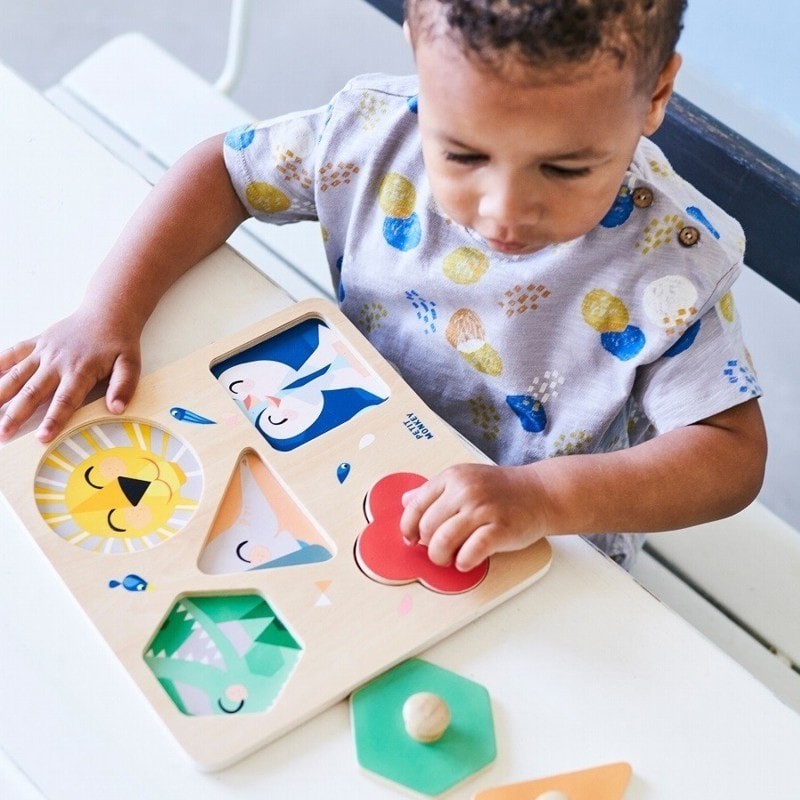 Pierwsze puzzle niespodzianka dla najmłodszych dzieci, których zadaniem jest rozwój koordynacji ruchowej oko-ręka poprzez dopasowanie odpowiedniego kształtu puzzli Pod każdym puzzlem kryje się jakiś zwierzak przyjaciel.