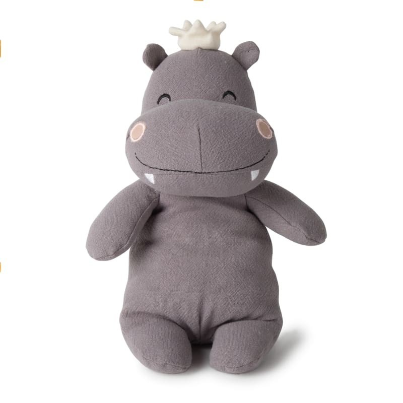 Przytulanka Pan Hipopotam Hilary w koronie na głowie.