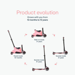- Nazwy kolejnych wariantów; Jeździk (12+ miesięcy), Ride-on (od 2 roku życia), Scooter (od 3 roku), Hulajnoga Xtend (od 9 lat)